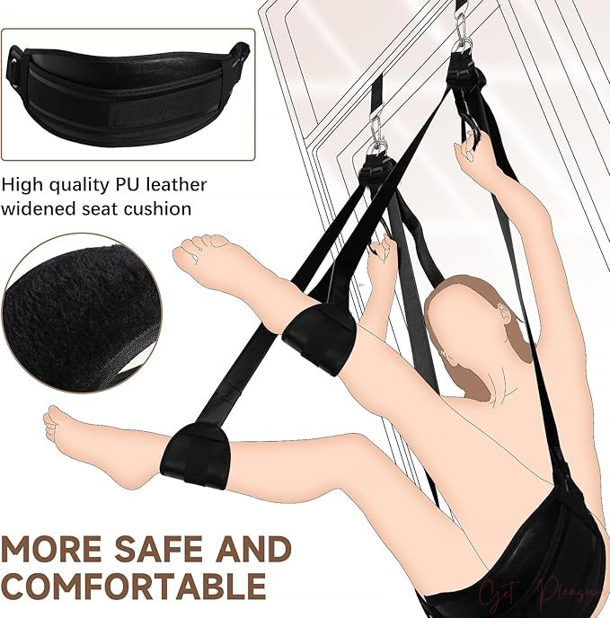 ▶️ Fully Adjustable Height & Length: The erotic sex swing conveniently fits over most standard doors, adjust the silicone buckle, pull each of the straps to the perfect length, allowing you to set up your play space quickly and easily. Different heights can shape different postures, separate the both legs of slave, and expose the private parts, licking with your tongue, facilitate insertion, easier G-Spot stimulation